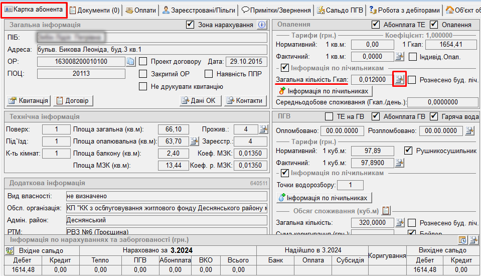 2) на вкладці "картка абонента" натиснути кнопку "лупа" біля "загальна кількість Гкал" :