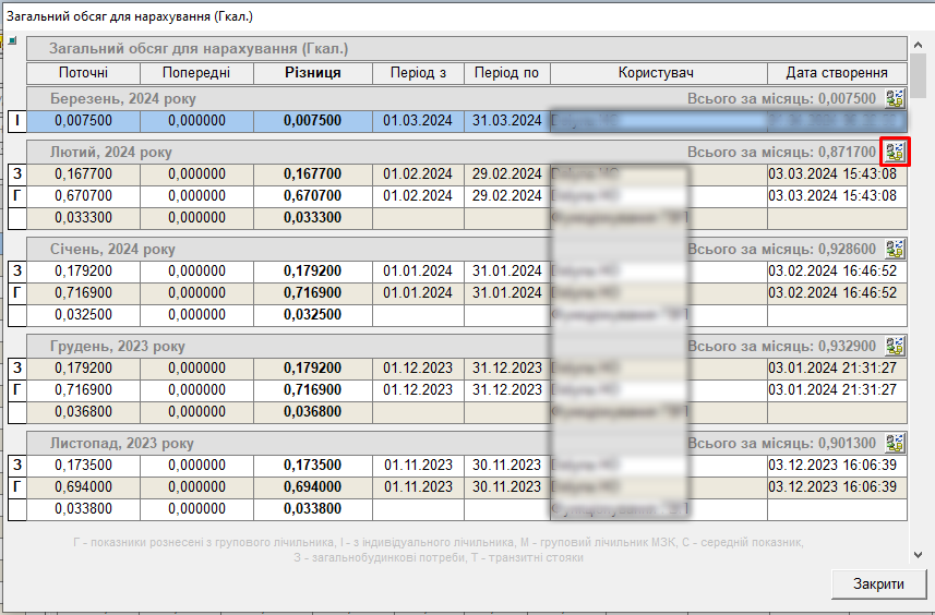 - нажати на кнопку "вивести інтервали"→ у вікні буде відображена інформація про зняття Гкал;