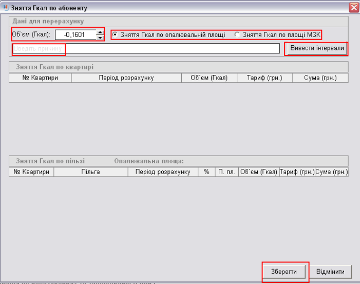 - обираємо: зняття Гкал по опалювальній площі чи зняття Гкал по площі МЗК (місця загального користування);