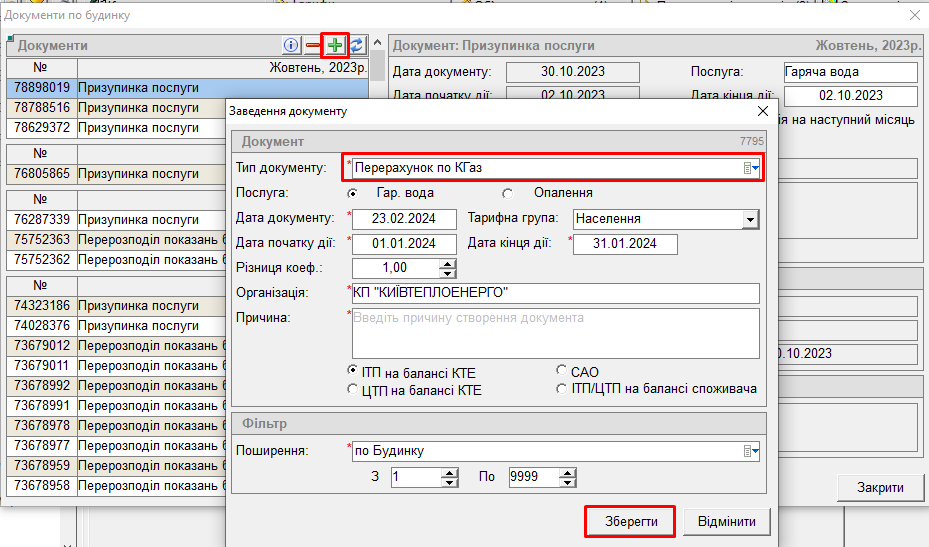 - Тип документу — вибрати “Перерахунок по КГаз”: