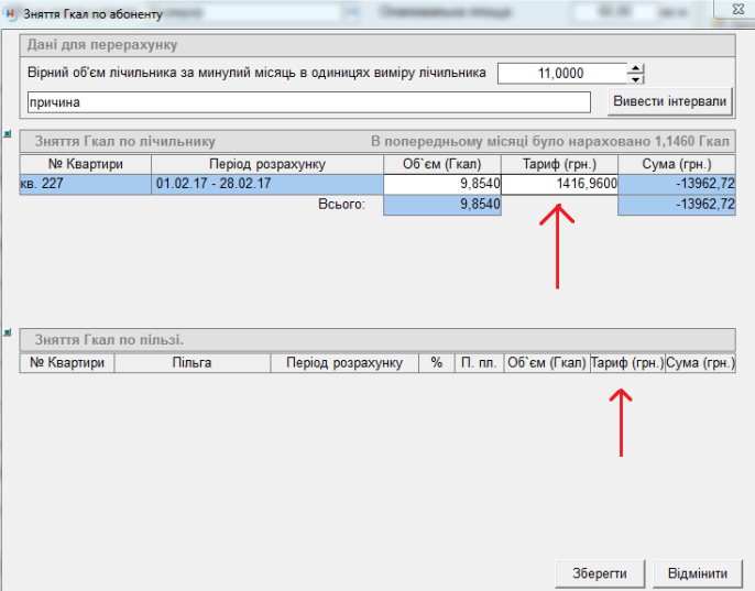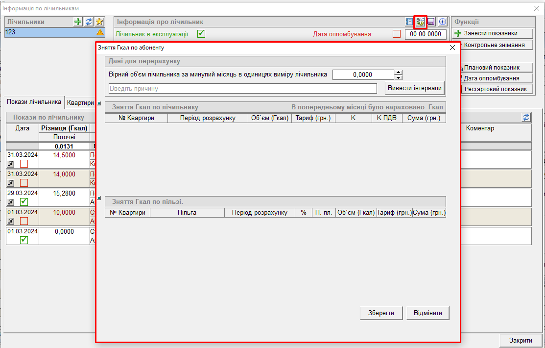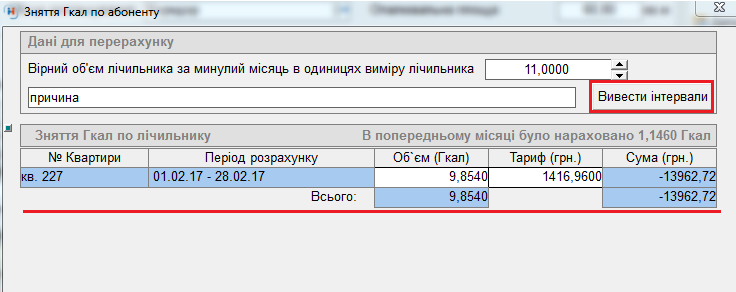 - у вікні "зняття Гкал по абоненту" заповнити: "вірний об'єм лічильника за минулий місяць в одиницях виміру лічильника"