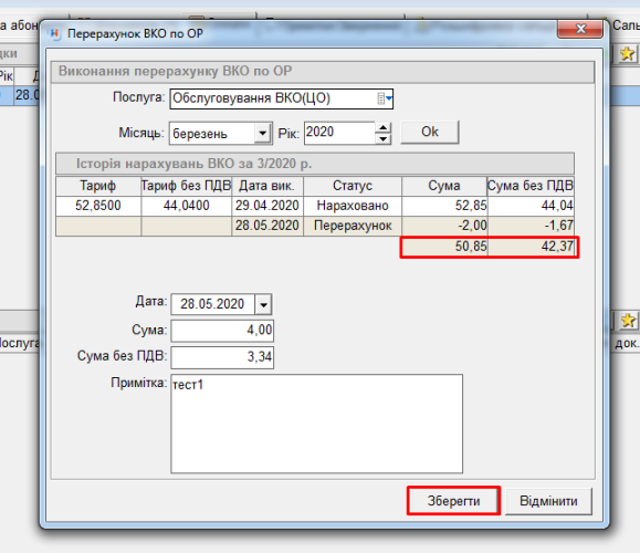 - вибрати місяць, та натиснути “ОК”, після чого відобразяться дані про поточне нарахування, та про перерахунки обраного місяця по вибраній послузі, якщо вони були: