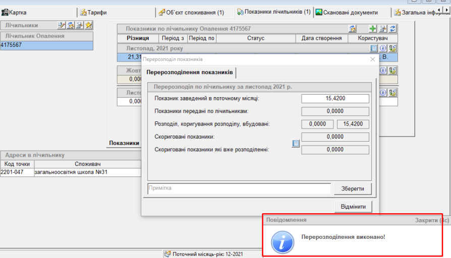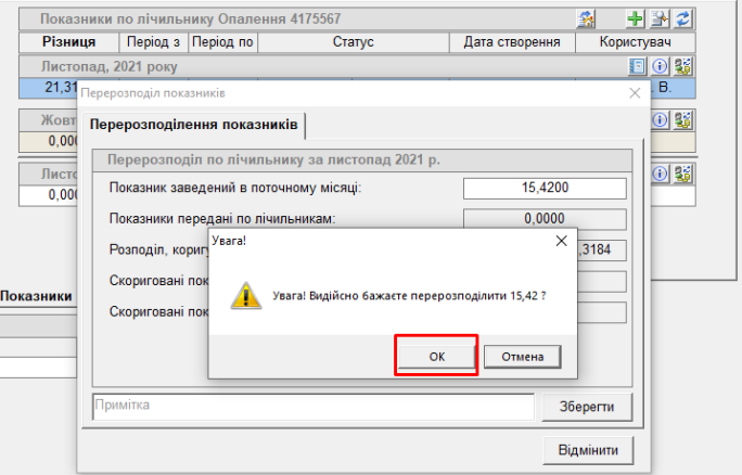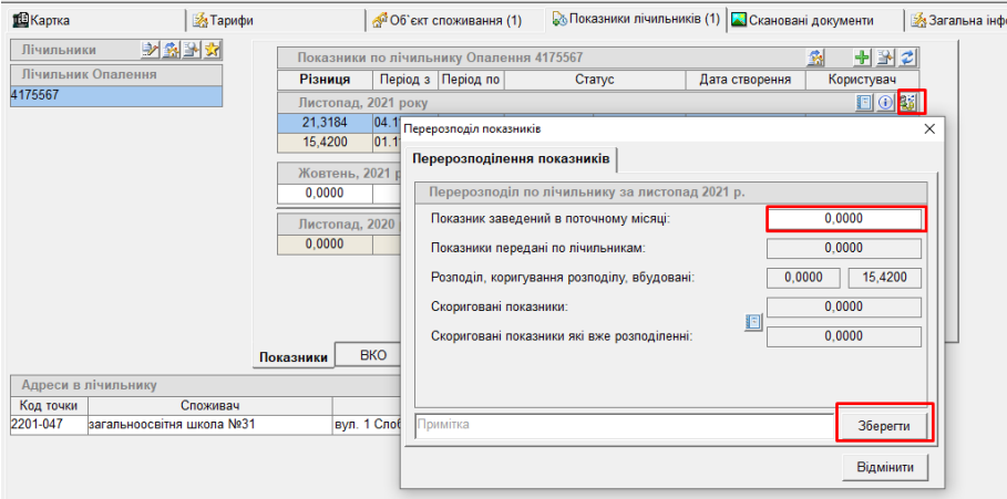 - у полі “Показник заведений в поточному місяці” вказати показник який потрібно перерозподілити, і натиснути Зберегти:
