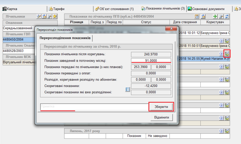 - вказати показник для перерозподілу, вказати примітку та натиснути Зберегти;