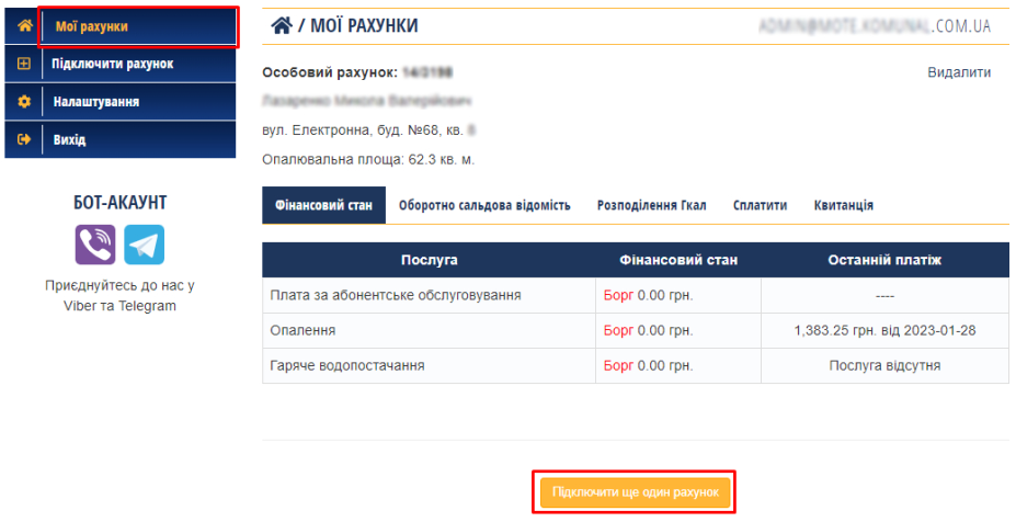 - Щоб переглянути інформацію по підключеним ОР, натиснути "Мої рахунки":