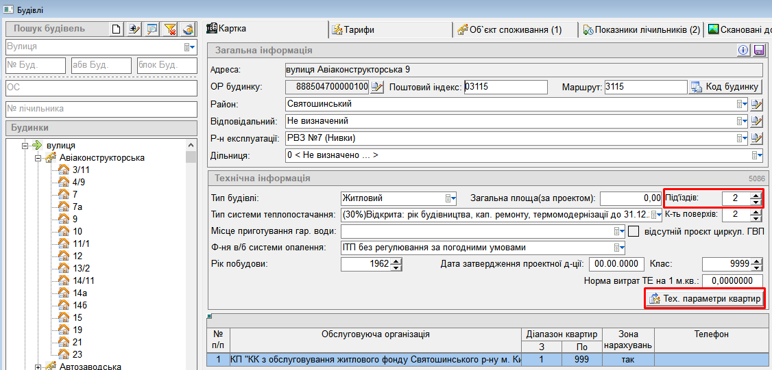 Розносимо дані по квартирам — натиснути кнопку "технічні параметри квартир". Проставляємо кількість квартир для кожного під'їзду, натиснути "рознести", в кінці — зберегти: