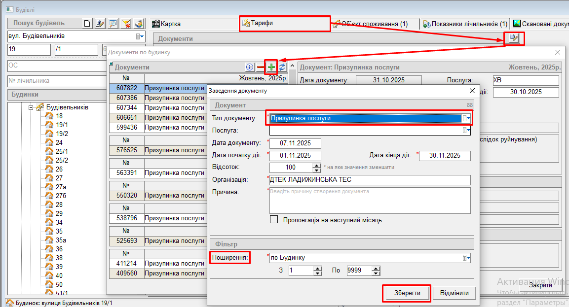 Також можливо заводити документ призупинки з поширенням по квартирам (наприклад з 1 по 100 квартиру раніше підключити до опалювального сезону, а потім з 101 по 200 квартиру допідключити з пізнішої дати початку опалювального сезону).