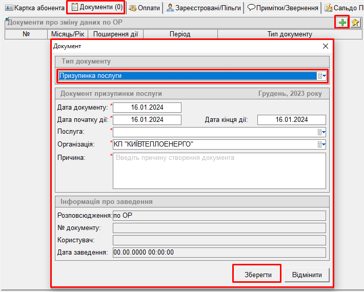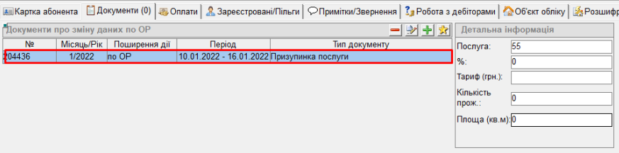 - після цього у вкладці "Документи" буде відображений заведений документ "Призупинка послуги":