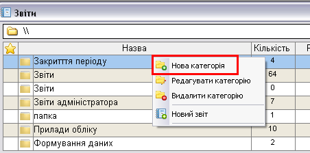 Для того, щоб Створити категорію (папку) звітів, необхідно — нажати праву кнопку миші → вибрати "нова категорія":
