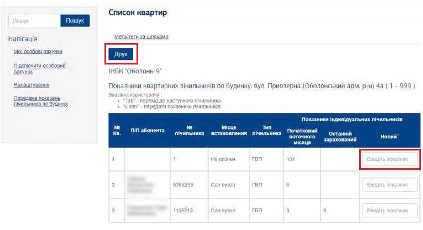 2. Вибрати потрібний будинок, і по вибраному будинку відкриється таблиця з списком квартир будинку, в яких є можливість передати показники лічильників ЦО або ГВП по квартирі