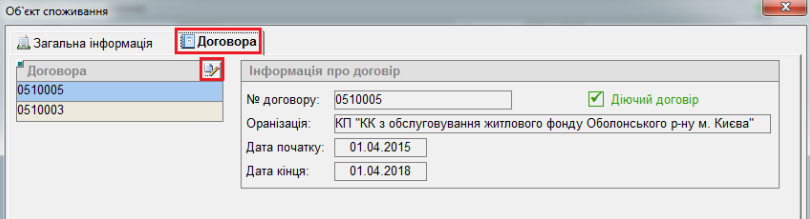 2) Біля об'єкта споживання нажати кнопку "лупа", відкриється вікно "Об'єкт споживання", у цьому вікні перейти на вкладку "Договора"