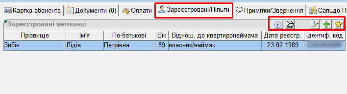 - "ручка з листком" - перегляд/редагування інформації про мешканця;