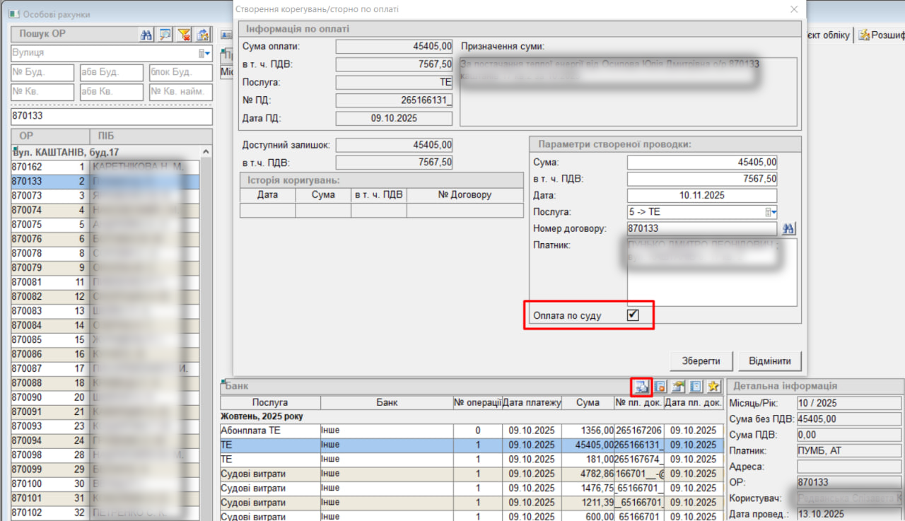 У вікні “створення коригувань по оплаті” є можливість проставляти галочку “Оплата по суду”: