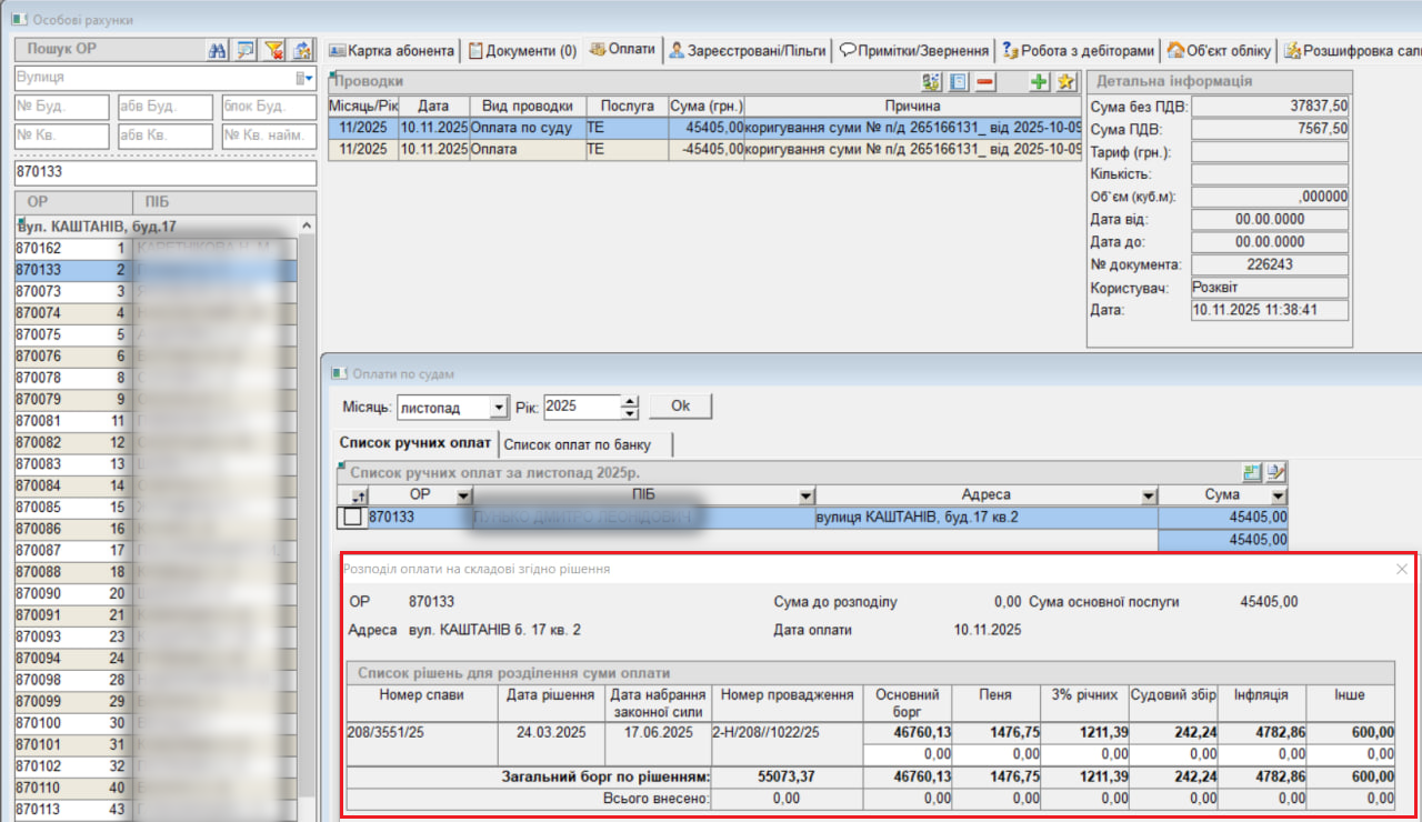 Розподілені оплати у вікні “Оплати по судам” будуть відмічені галочкою та зеленим кольором: