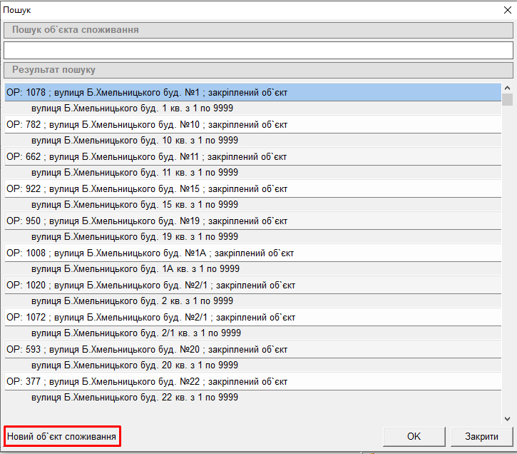 1. Якщо на будинку ще не було створено об'єкт споживання (ОС), тоді потрібно створити ОС:
