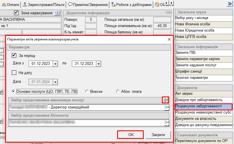 Розрахунок заборгованості — при виборі цього пункту відкриється вікно: