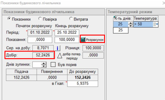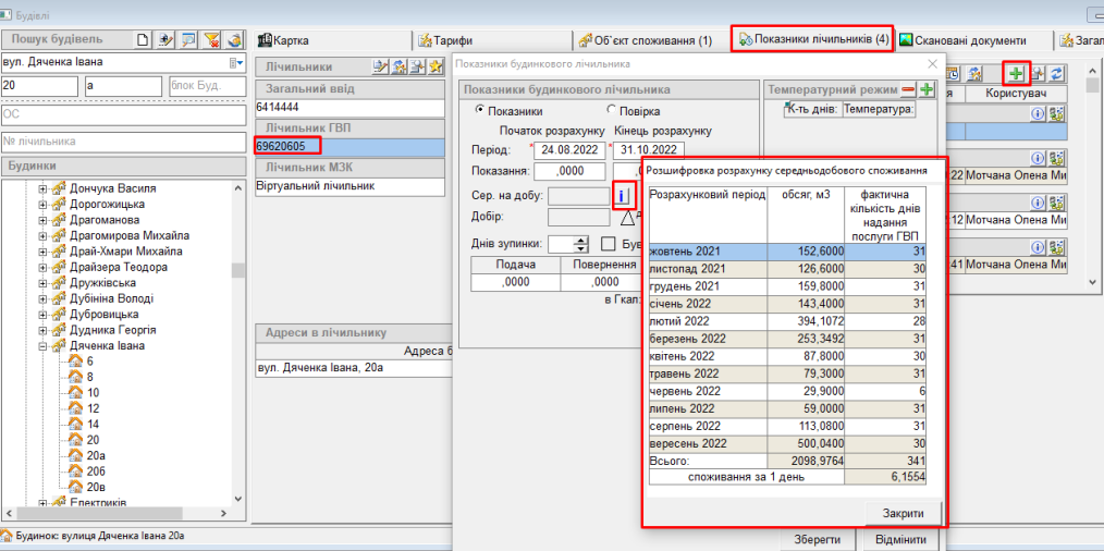 - і у вікні "Показники будинкового лічильника", біля пося "Сер. на добу", натиснути кнопку "і",