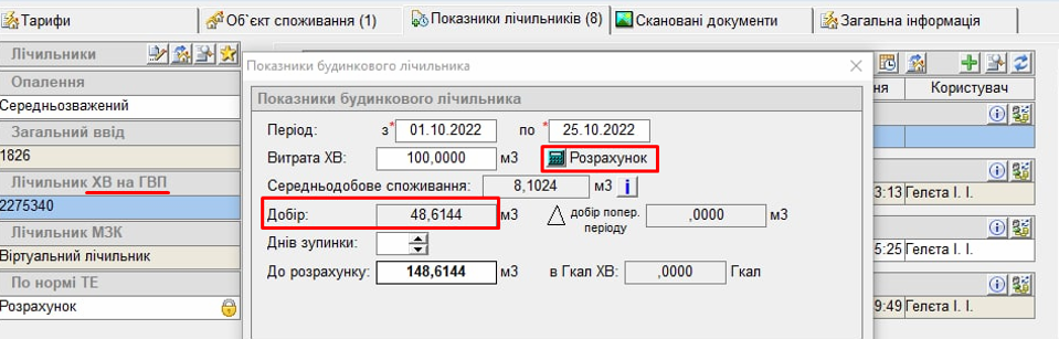 Добір розраховується автоматично при натисненні кнопки розрахунок та при збереженні показників. Алгоритм розрахунок добору такий же як для лічильників ГВ.
