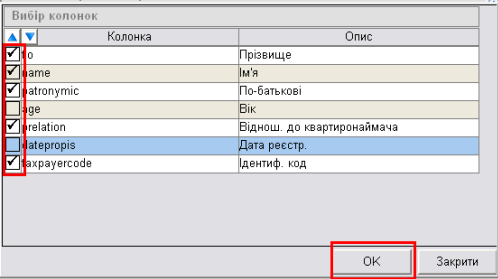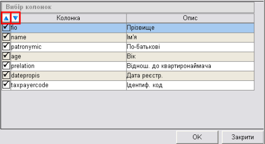 виділяємо потрібну колонку синім фоном (клацнувши по ній один раз лівою клавішою миші) і стрілками вверх/вниз розміщуємо колонки у потрібному порядку, далі — ОК, і колонки стануть у заданому порядку.
