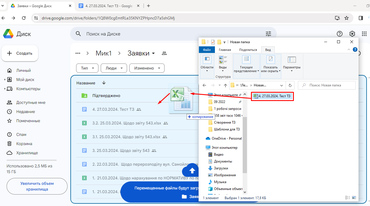 Отже, щоб завантажити додаток з комп'ютора у папку з заявками, - потрібно відкрити папку з додатком, і перетягнути його у папку з заявками: