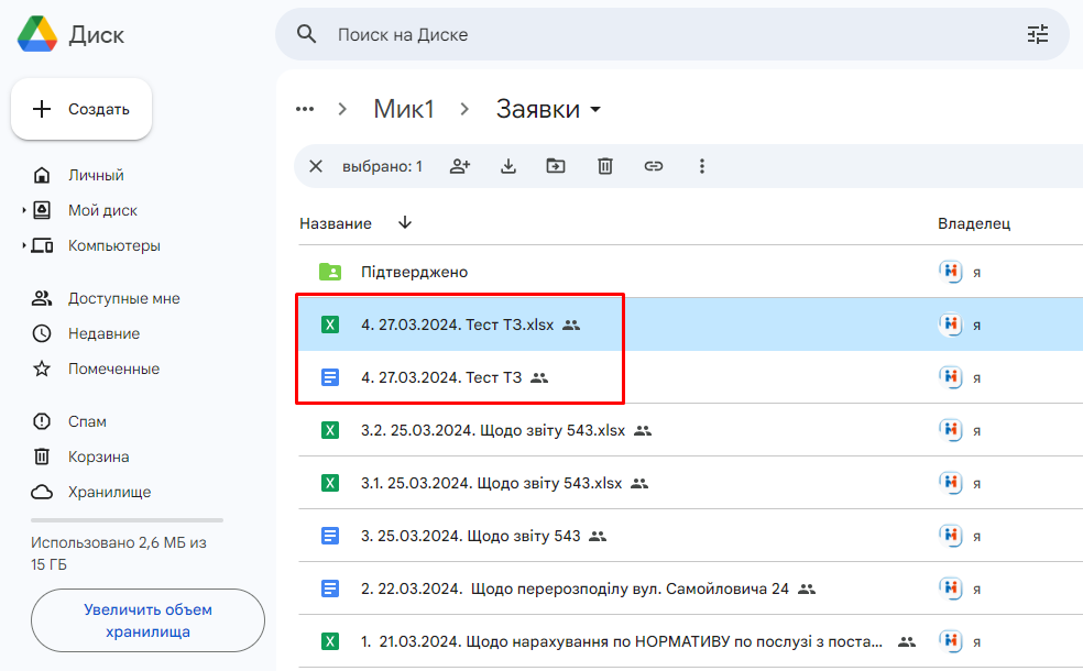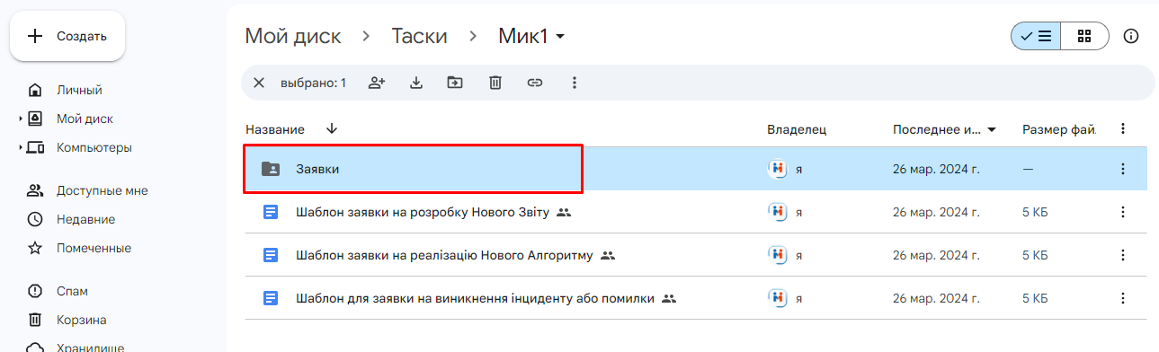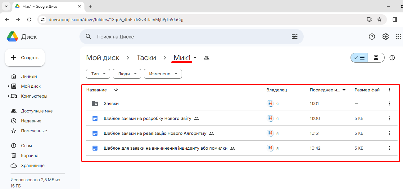 1. Заходимо на гугл диск по наданому Розробником посиланню, і відкриється папка для заявок (ТЗ):