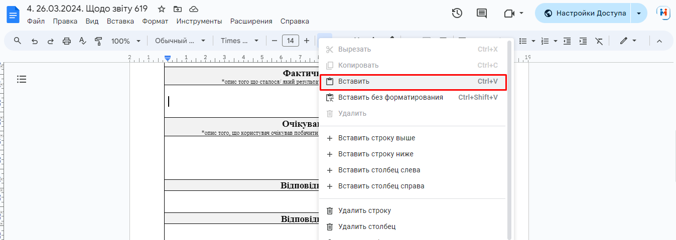 - і вставити скопійований скріншот у заявку - натиснувши Ctrl + V або права кнопка миші і вибрати "Вставить":