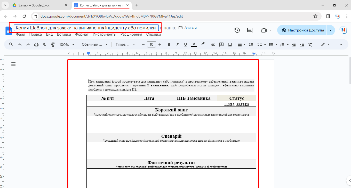 8. Зверху, у відкритому шаблоні, клацнути на назві, і редагуємо назву заявки.