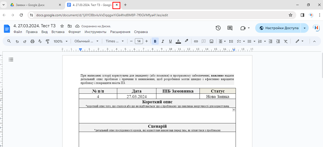 9. Після опису заявки, - можна закривати вкладку з заявкою, - записана інформація зберігається автоматично: