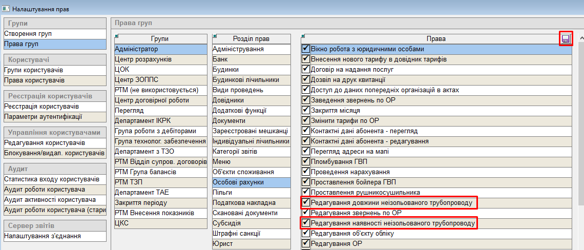 Для редагування інформації про трубопровід користувачу потрібно надати такі права: