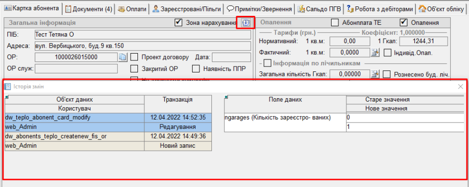 Щоб переглянути історію змін по особовому рахунку:- у картці потрібного ОР натиснути кнопку "і",- відкриється вікно "Історія змін", - у якому відображено історію змін: Історія змін по ОР