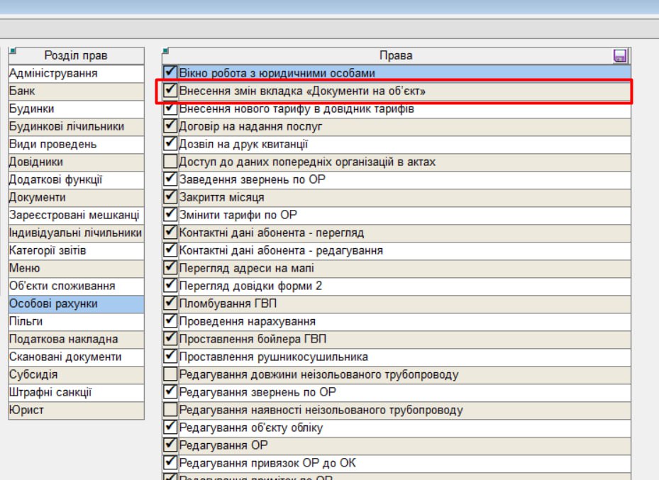 Для роботи з вкладкою "Документи на об'єкт" користувачу потрібно надати такі права: