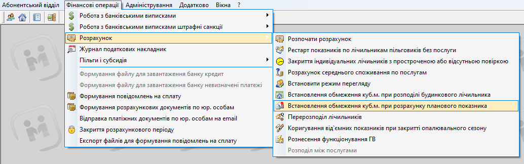 Щоб "встановити обмеження куб.м при розрахунку планового показника", переходтмоу меню: Фінансові операції — Розрахунок - Встановлення обмеження куб.м при розрахунку планового показника: