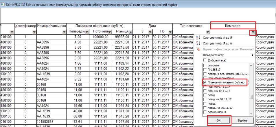 Для того, щоб подивитись по яким особовим рахункам рознісся показник по бойлерам, потрібно побудувати звіт 317, у колонці "Коментар" вибрати фільтр "Плановий показник бойлер" і буде відображений звіт з особовими рахунками, по яким був рознесений плановий показник по бойлеру: