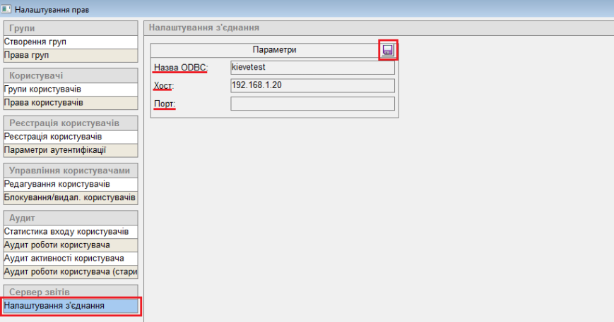 - Перейти в “Адміністрування” - “Налаштування прав” - “Права користувачів” - вибрати потрібного користувача - “Додаткові функції” - “Зміна джерела даних для звітів” - нажати Зберегти (дискета) :