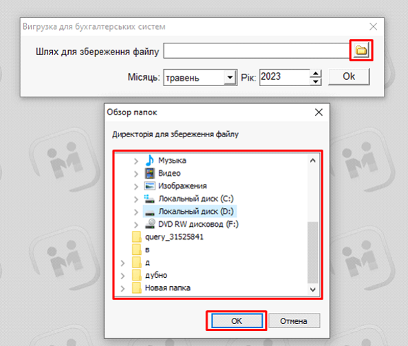 3. Натиснути кнопку «папка», та вибрати у яку папку потрібно вивантажити сформований файл: