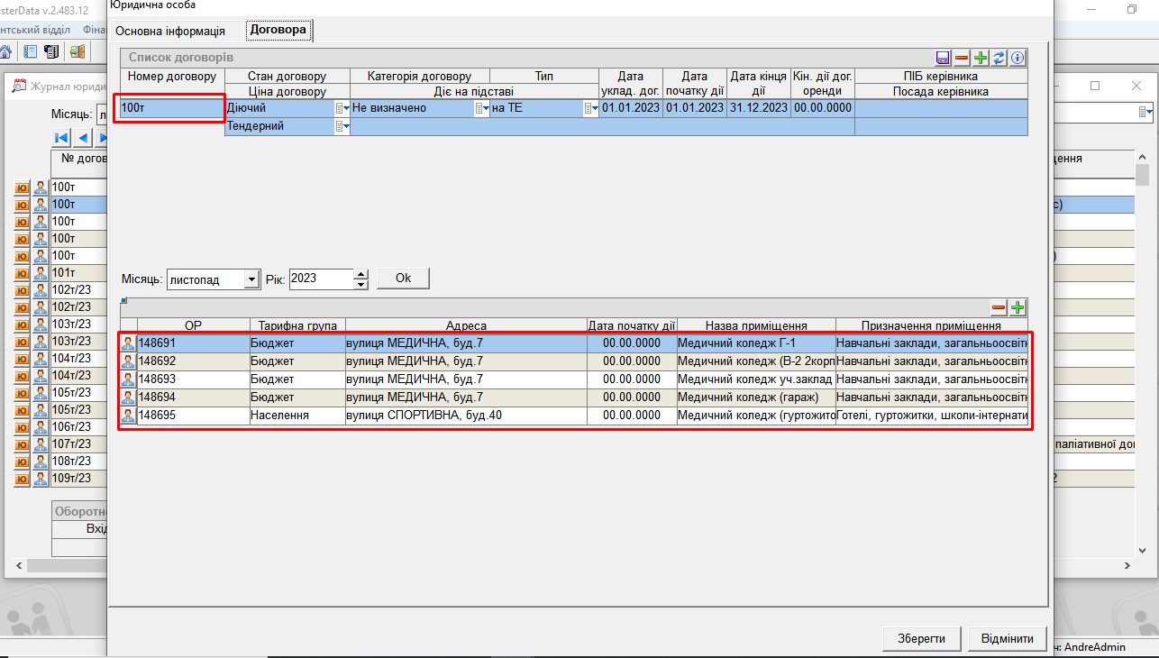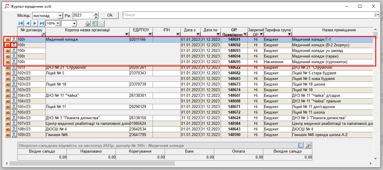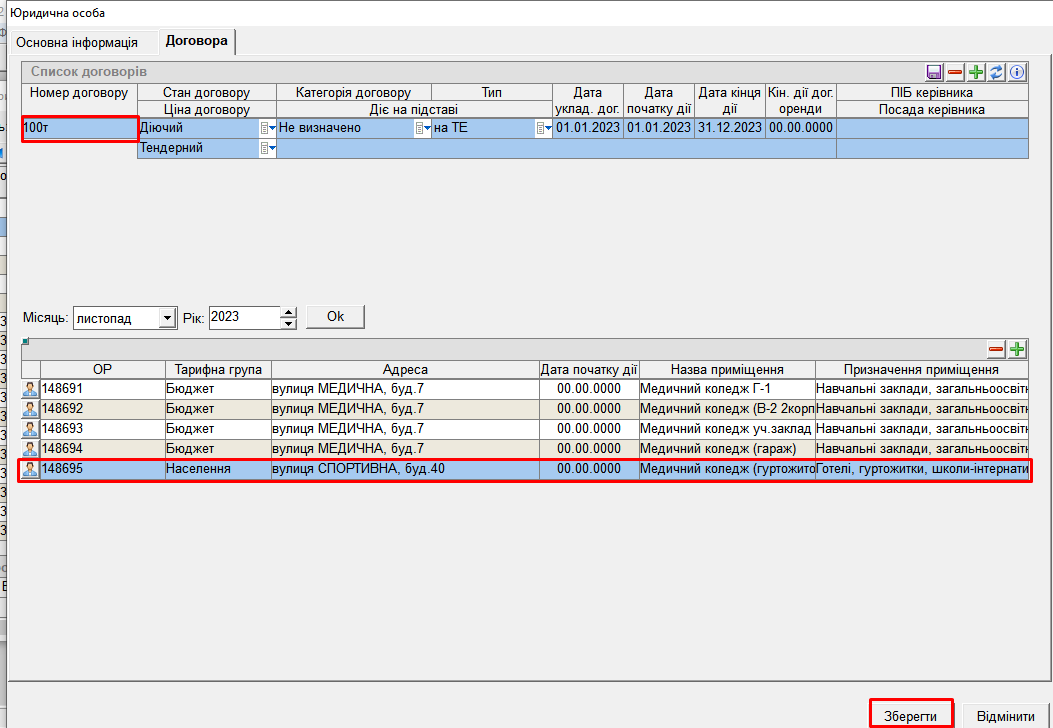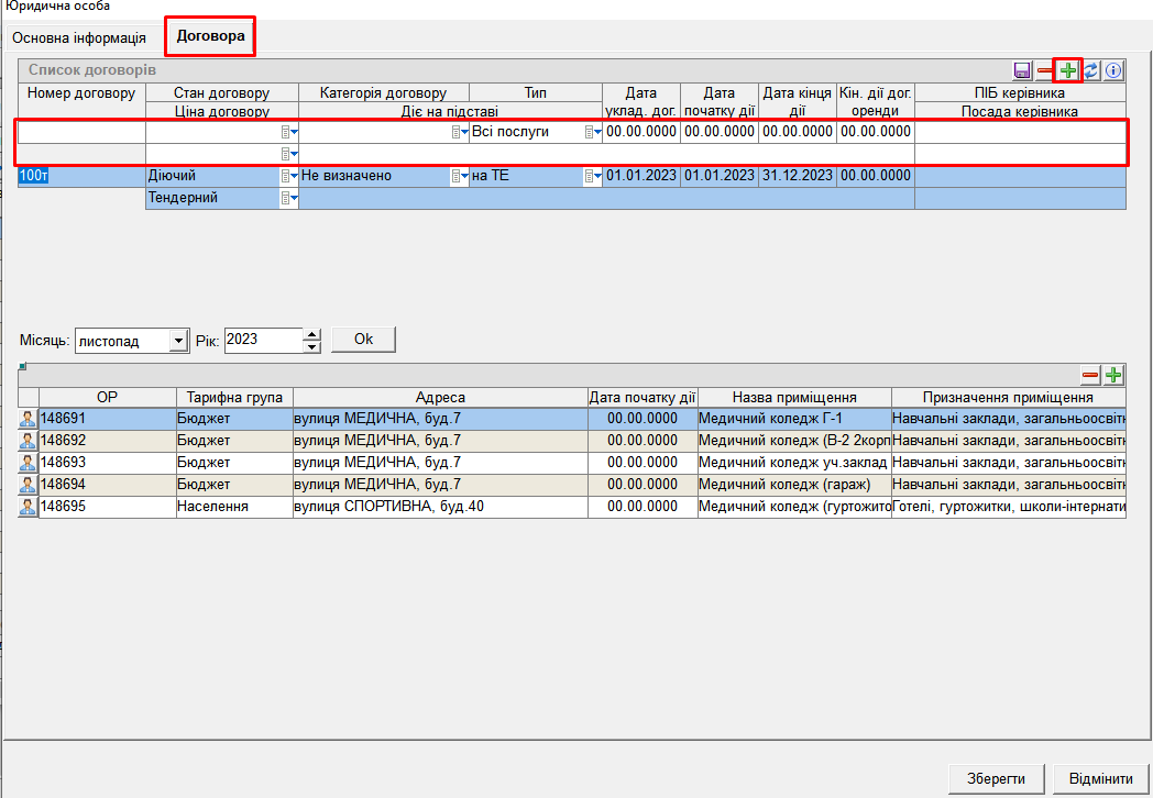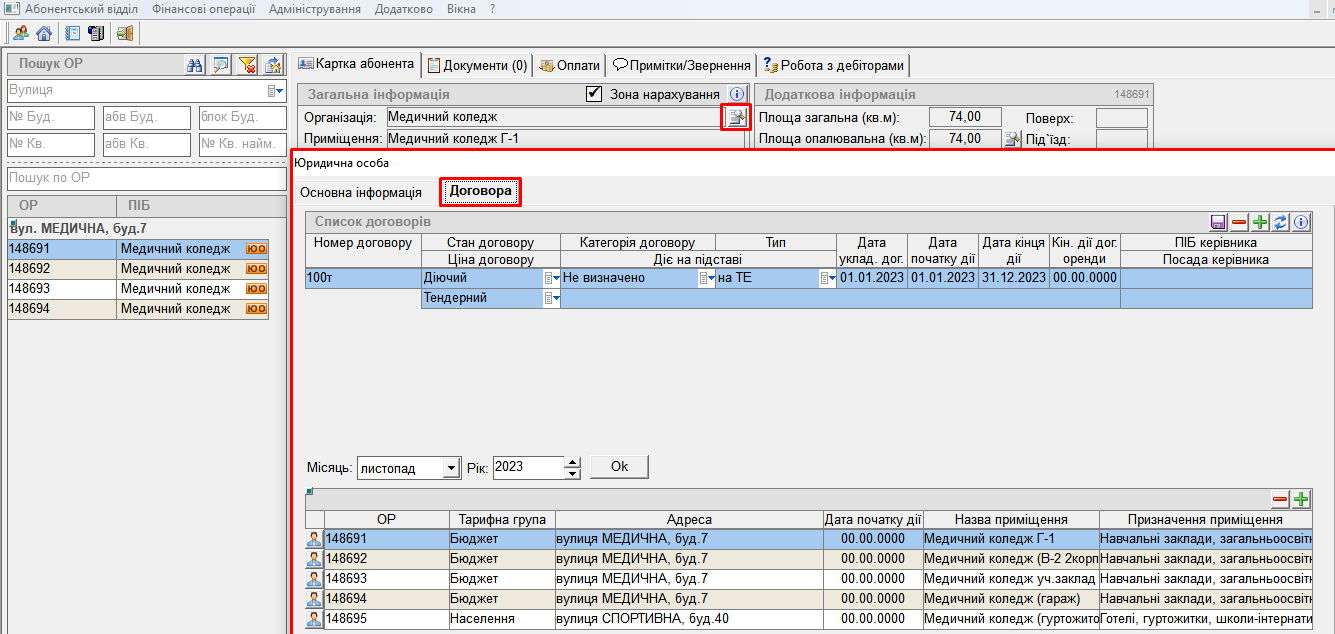 Якщо на договір Юридичної особи є заведені особові рахунки (приміщення), вони будуть відображені у блоці знизу.