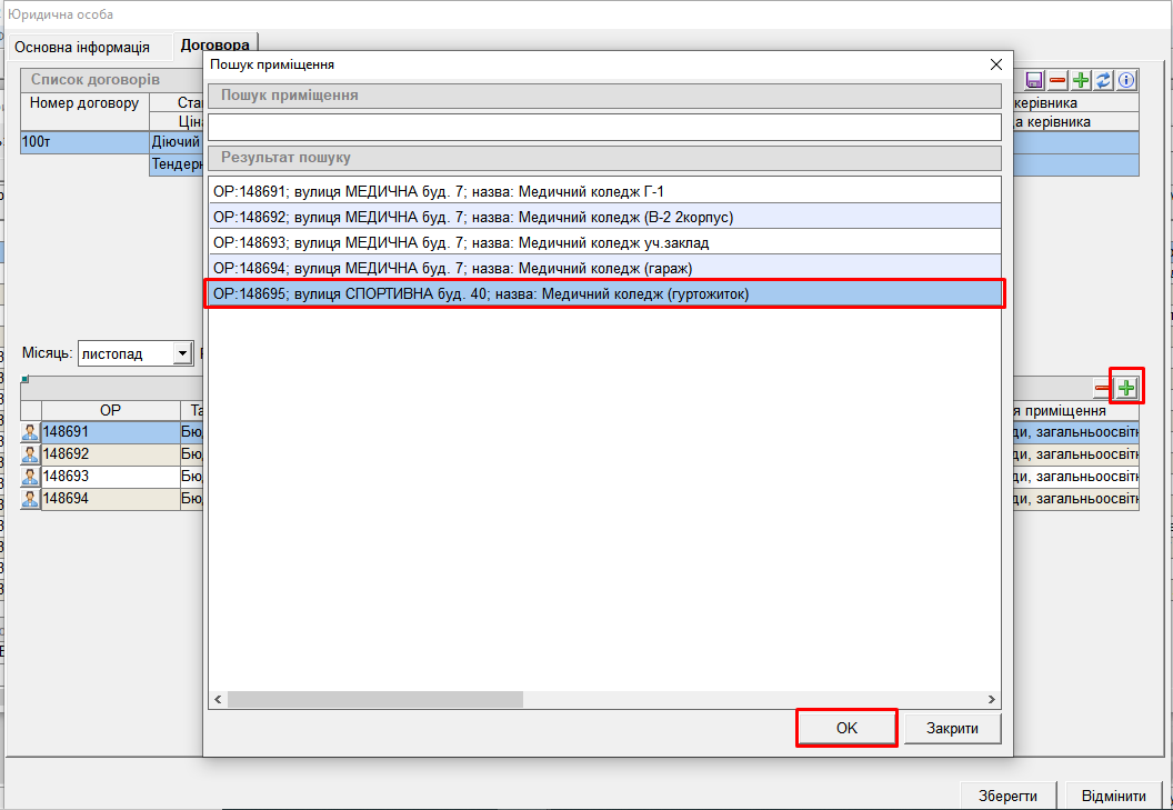 - вибрати потрібне приміщення цієї юридичної особи, і знизу натиснути ОК":
