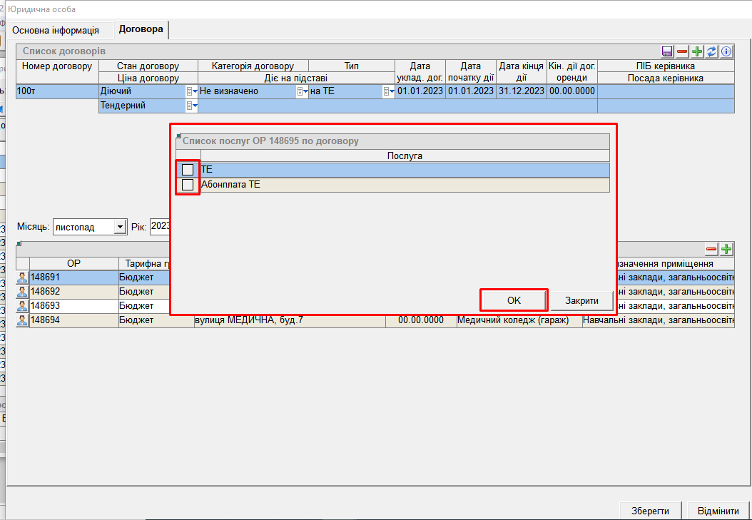 далі відкриється вікно, у якому потрібно вибрати послуги які надаються приміщенню по договору, і натиснути "ОК":