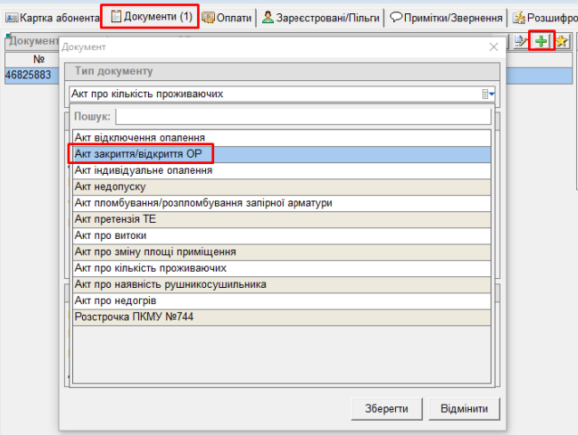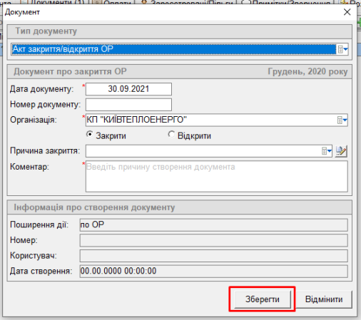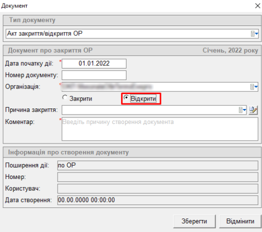 - Тип документу вибрати "Акт закриття/відкриття ОР";