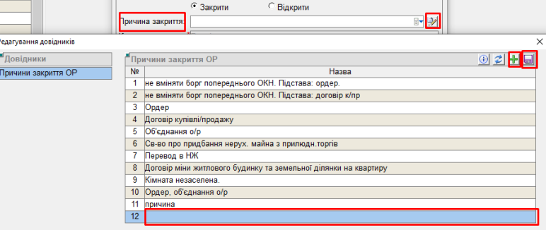 - вибрати Причину закриття, якщо у списку причин немає потрібної, можна доповнити довідник, натиснувши кнопку "листок з ручкою":