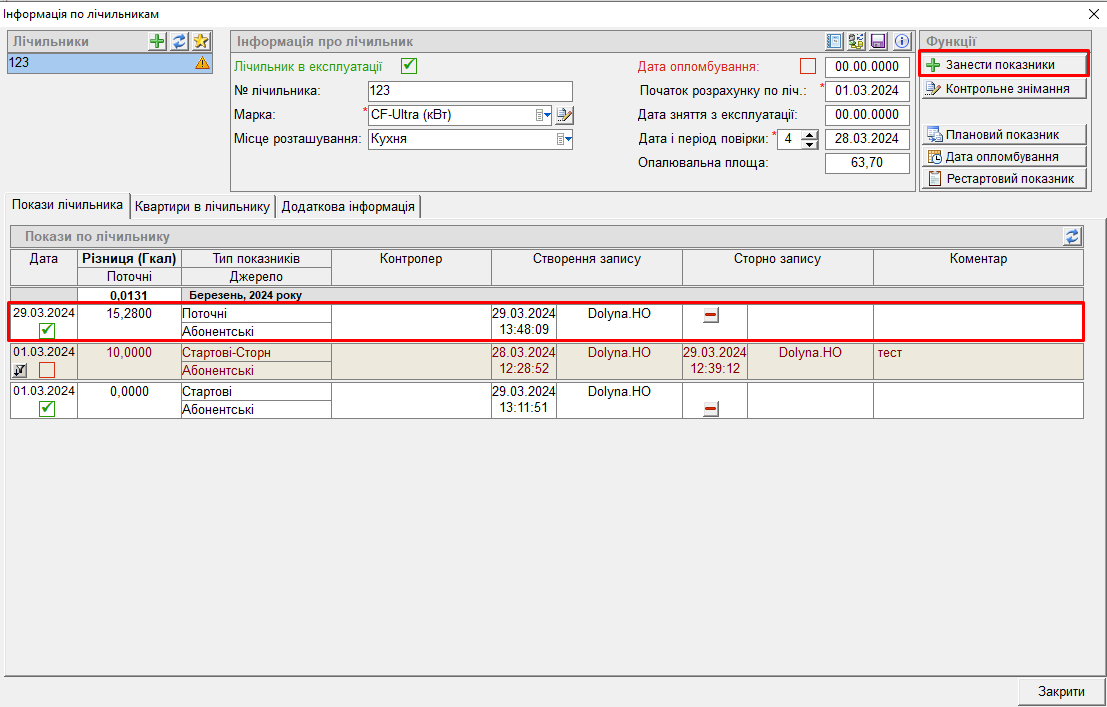 Якщо потрібно занести нові показники по лічильнику, - у блоці "Функції" натиснути кнопку "+Занести показники" - вказати нові показники на кінець місяця - "Зберегти" - і у вкладці "Покази лічильника" побачимо нові показники: