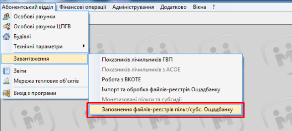 2. Далі: Абонентський відділ — Завантаження — Заповнення файлів-реєстрів пільг/субс. Ощадбанку: