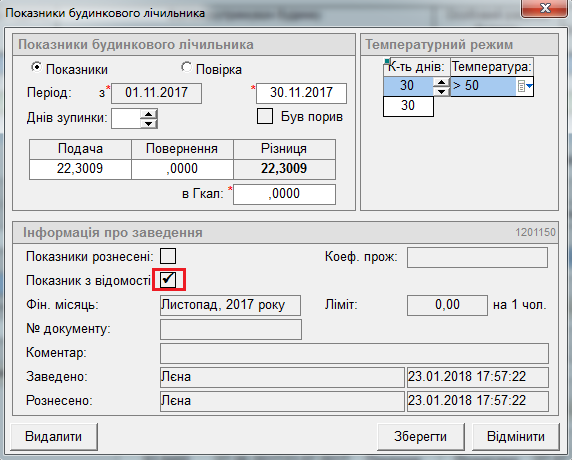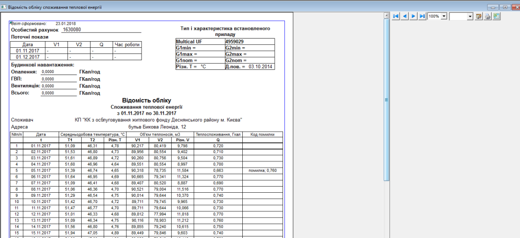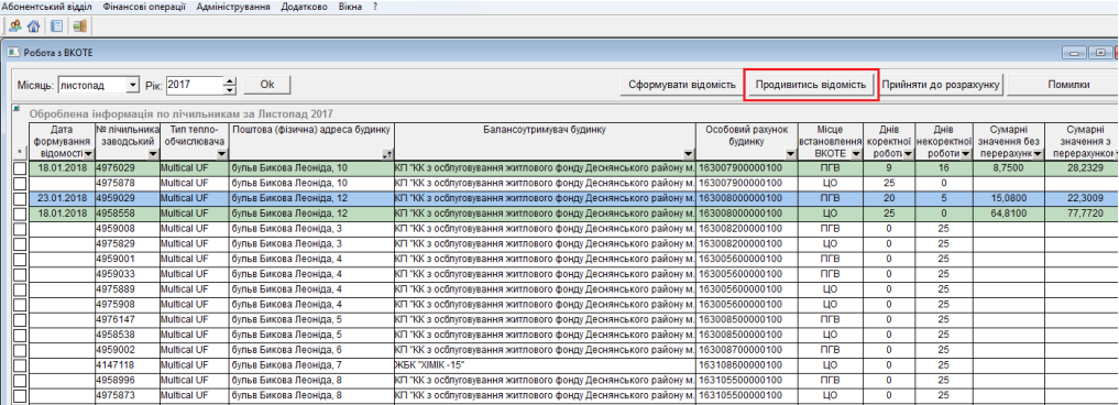Для того, щоб переглянути інформацію по дням, потрібно виділити лічильник і нажати кнопку "продивитись відомість":