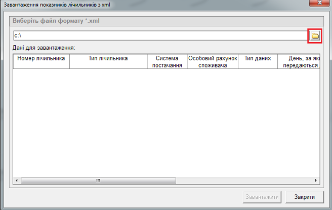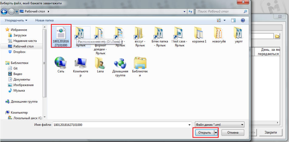 - нажати на кнопку "папка" та вибрати потрібний файл для завантаження даних, нажати "Открыть":
