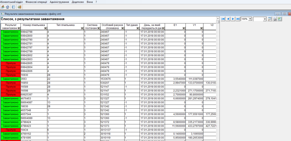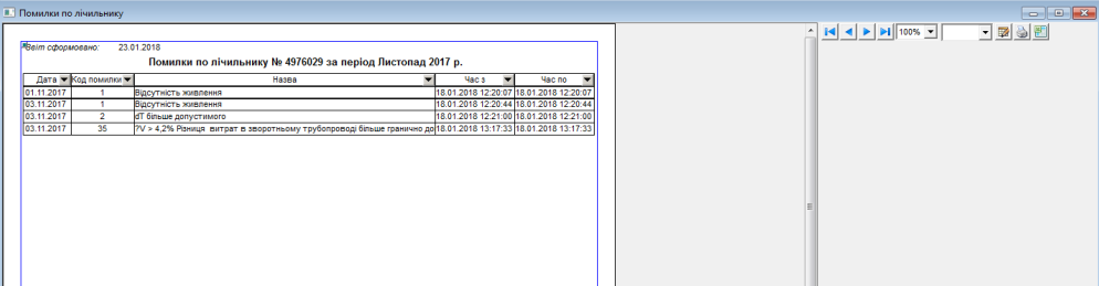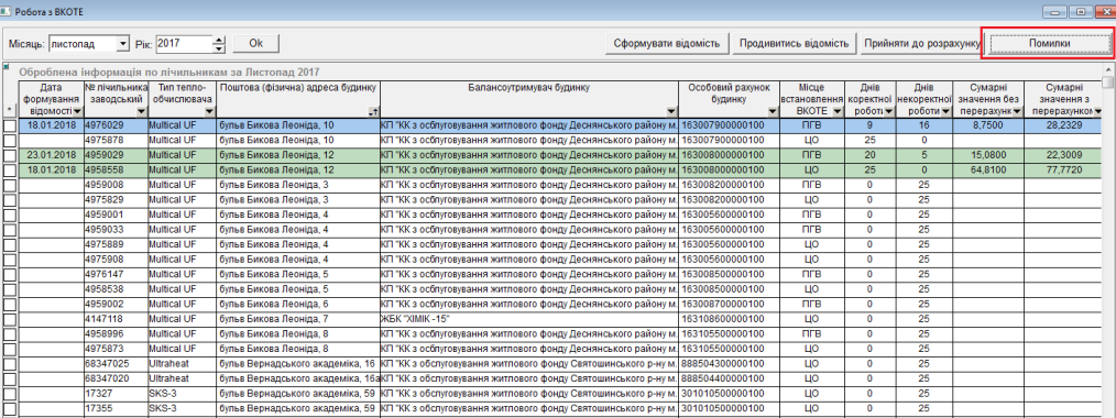 Якщо є помилки, відкриється список з помилками по лічильнику: