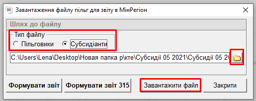 - Виберіть Тип файлу який Ви завантажуєте (пільги або субсидії);