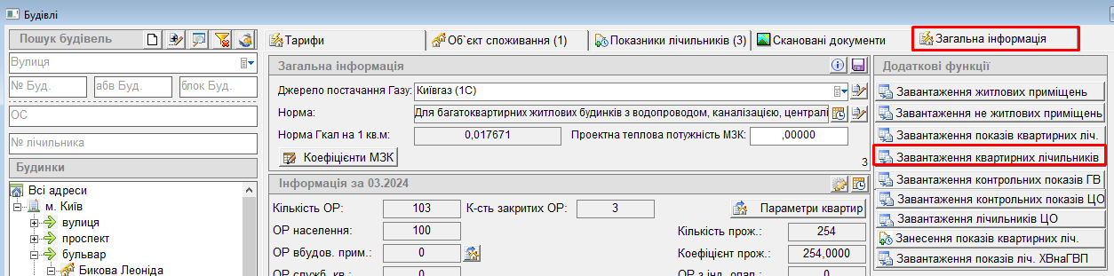 3. у вікні "Будинки" перейти на будинок, відкрити вкладку "Загальна інформація", і натиснути "Завантаження квартирних лічильників":