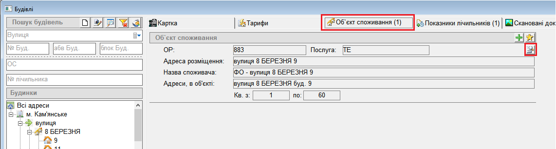 Абонентський відділ → Будівлі (знайти необхідний будинок, ввівши потрібну адресу) → перейти на вкладку "об'єкт споживання" :