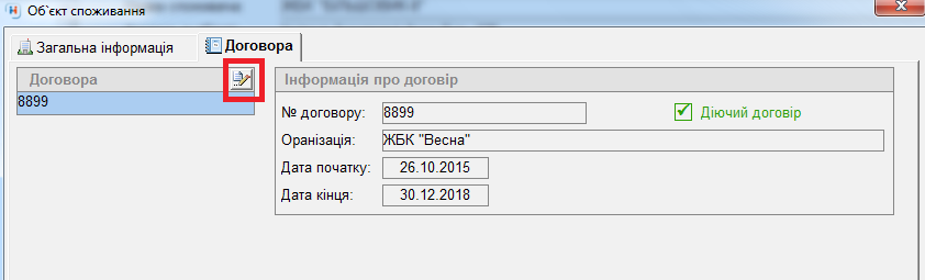 В "об'єкті споживання" натиснути кнопку "лупа" → відкриється вікно, у якому переходимо на вкладку "Договора" → натиснути кнопку "листок зручкою" для редагування договору: