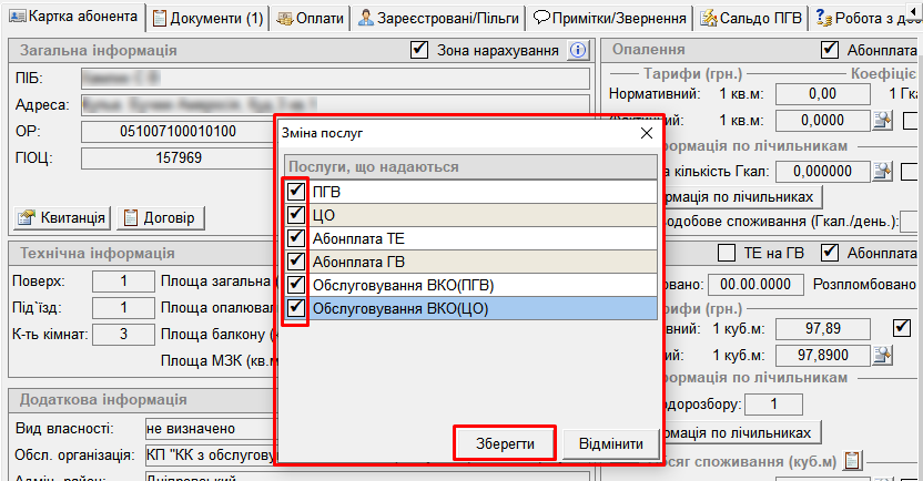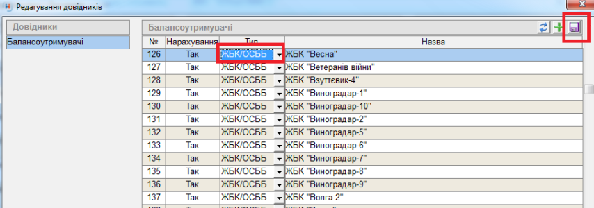 Змінюємо тип балансоутримувача ЦПГВ на ЖБК (ОСББ, КП, Інвест чи ін.). Та натиснути кнопку "зберегти" (дискета).